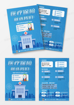 蓝色网格纹理背景卡通医疗保险宣传单页