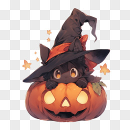 戴着魔法帽的可爱黑猫趴在南瓜灯元素