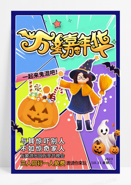 手绘插画风万圣节挥舞着魔法棒让南瓜灯飞舞魔女元素