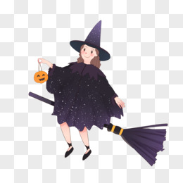 手绘卡通万圣节之坐在扫帚上的小巫女