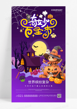 紫色万圣节奇妙夜卡通人物万圣节手机海报