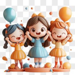 3D立体风格聚会开派对三位可爱女孩免抠元素