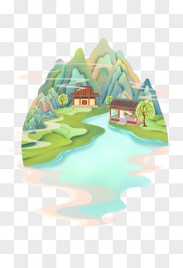 手绘国潮风春季山水微景观素材