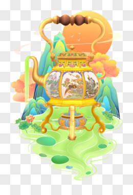 手绘新中式国潮画珐琅开光提梁壶山水微景观免抠元素