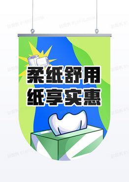 蓝绿色简约手绘风纸巾卷纸卫生纸吊旗