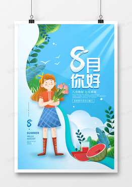 简约大气八月你好小清新创意月份问好海报