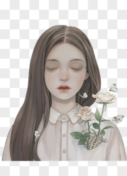 手绘风格的短发小女孩用鼻子闻盛开的花朵的免抠元素