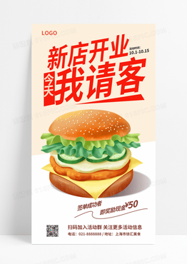 黄色简约创意新店开业我请客活动福利汉堡美食餐饮海报