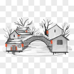 手绘古风水墨建筑拱桥元素