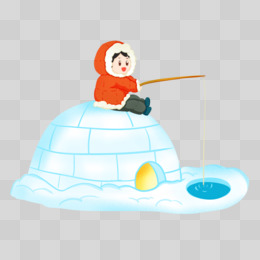 卡通手绘在冰屋上钓鱼元素