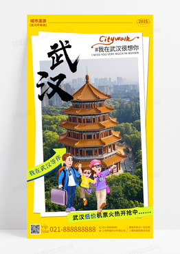 黄色简约城市武汉地标城市漫游旅游手机海报