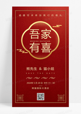 红金中式古典风吾家有喜婚礼邀请函手机海报