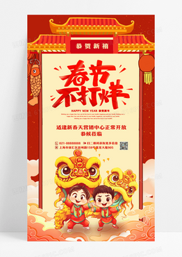 喜庆插画舞狮子春节过年不打烊手机宣传海报