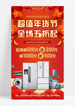 红色喜庆超值年货节全场五折起家电特惠五折优惠海报