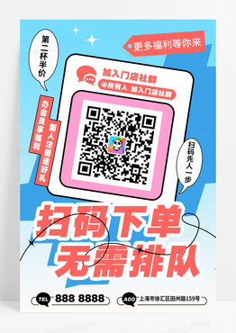 蓝色简约扫码下单二维码关注海报