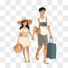 卡通一对年轻情侣拿着行李夏季旅行免抠元素
