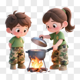 —组卡通手绘学生儿童军训之烧火做饭元素