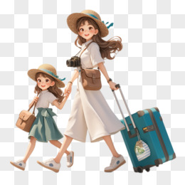 3D卡通妈妈和女儿拿着行李旅行免抠元素