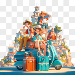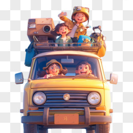 3D卡通一群人开车自驾旅行免抠元素