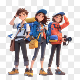 3D卡通三个年轻人拿着相机旅行免抠元素