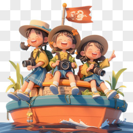 3D卡通三个小女孩坐着小船游玩免抠元素