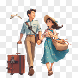 3D卡通一对年轻情侣拿着行李夏季旅行免抠元素