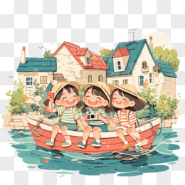 卡通三个小女孩坐船游玩2免抠元素