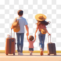 3D卡通一家三口拿着行李旅行的背影免抠元素