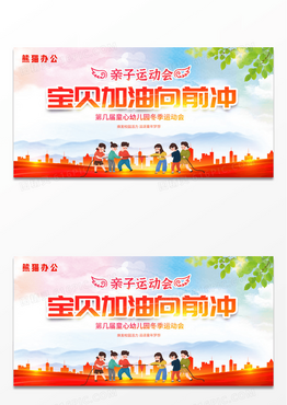 红色渐变宝贝加油向前冲幼儿园亲子运动会展板设计