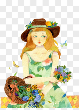 手绘风格的短发小女孩用鼻子闻盛开的花朵的免抠元素
