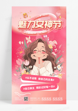 浪漫粉色插画风魅力女神节妇女节三八节宣传海报