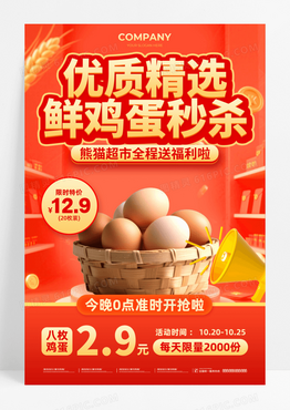 红色3D风优质精选鲜鸡蛋秒杀促销活动宣传文案海报