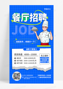 蓝色简约线条手绘厨师美食招聘手机文案海报