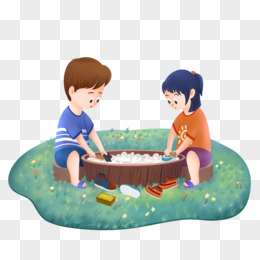 手绘小男孩小女孩在草地上一起刷鞋场景