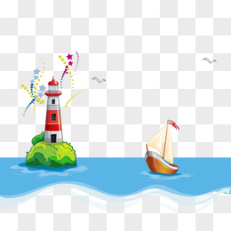 卡通手绘大海导航塔小船