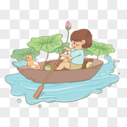 卡通手绘男孩和小狗在荷塘划船免抠元素