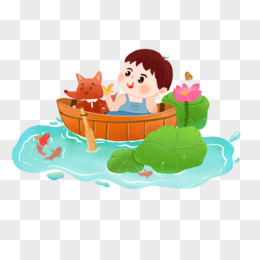 卡通手绘男孩带着小狗游览荷塘免抠素材