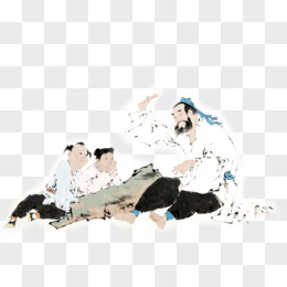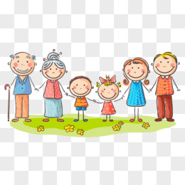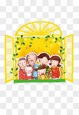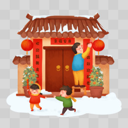 手绘卡通新年大人贴春联小孩们玩耍场景免抠素材