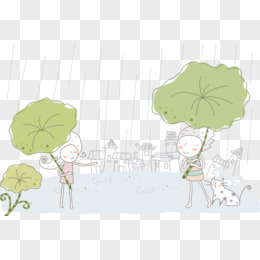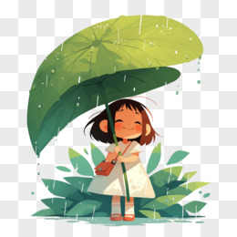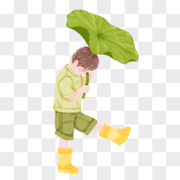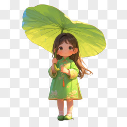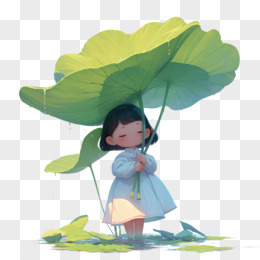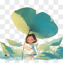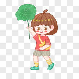 手绘风格夏装小女孩举着荷叶大步走路素材