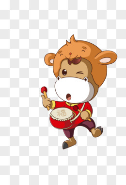 大鼓的牛卡通带小猴子帽子