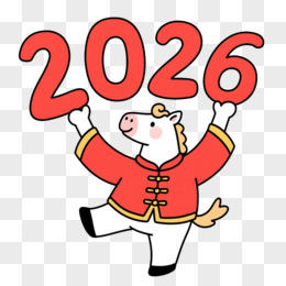 卡通-穿着红色冬季唐装衣服的白色小马举着2026免抠元素