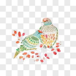 国画风两只彩色的小鸟停留在开满石榴花的树枝上嬉闹免抠元素