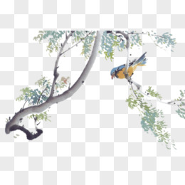 手绘卡通女孩坐在树叶上和小鸟打招呼素材