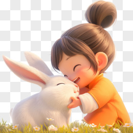3D卡通小女孩和白兔免抠元素