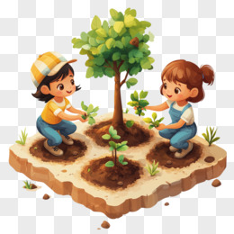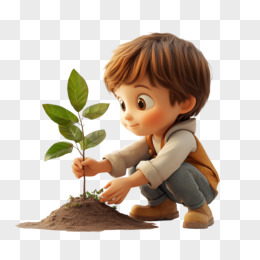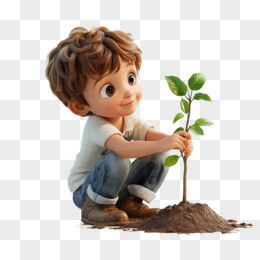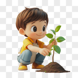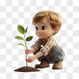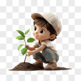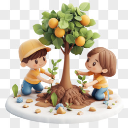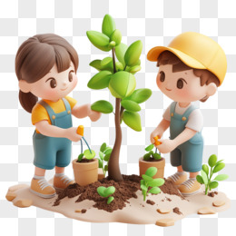 3D风格小朋友种植树苗的免抠元素