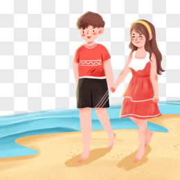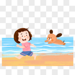 手绘可爱海边奔跑的女孩和宠物狗素材