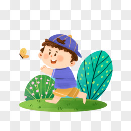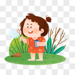 卡通手绘女孩光脚走在草地上抓昆虫免抠元素