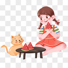 手绘光脚吃西瓜的女孩免抠元素