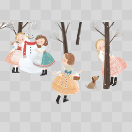 手绘卡通女孩冬季堆雪人免抠元素