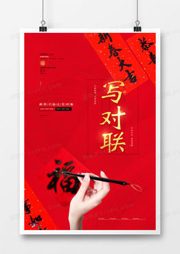 红色创意新年习俗写对联海报设计
